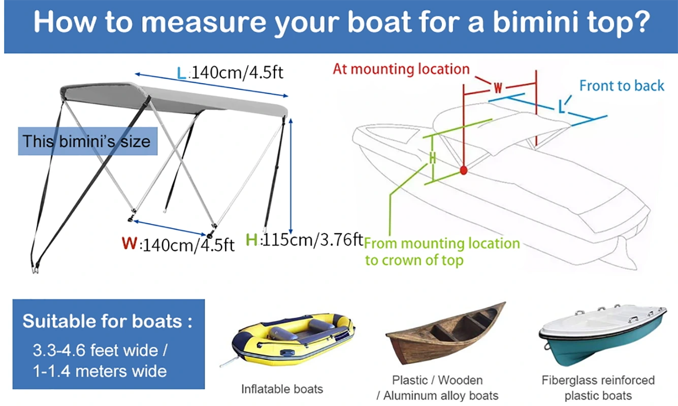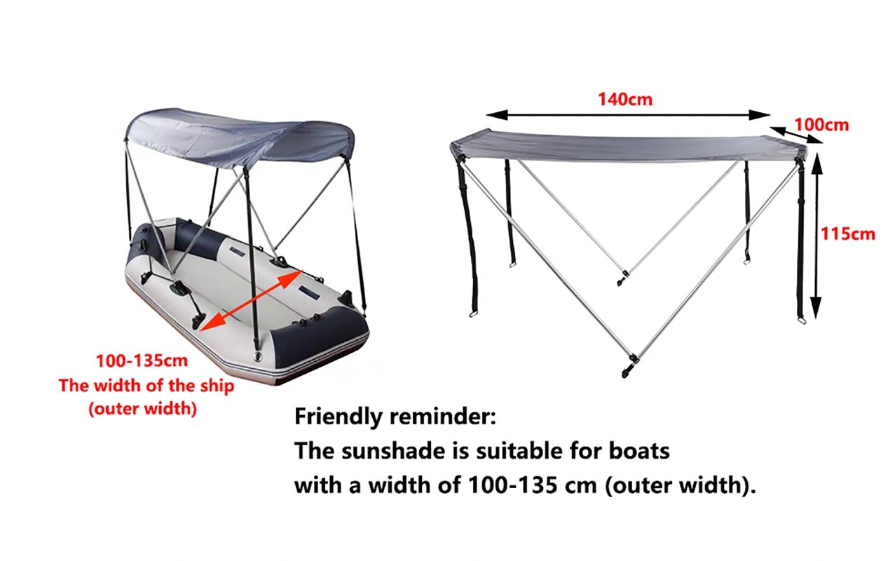 Kanupew magħmul minn drapp Oxford 210D, reżistenti għall-umdità, kontra x-xita. Materjal ta 'grad marittimu 210D Bimini top huwa kanupew tax-xemx multi-funzjonali għall-baħar li jista' jirreżisti s-sħana tax-xemx u jżomm lilek u lill-familja tiegħek sabiex tkun tista 'tgawdi esperjenza komda u ħielsa sikura fuq il-baħar.