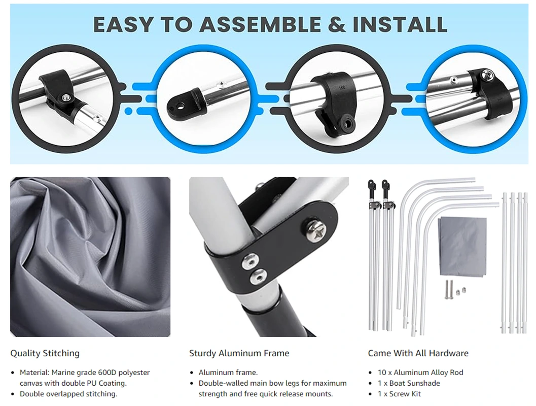 Aluminum Extensible Boat Canopy.Suitable għal dinghy li jintefħu, canoe, kayak, dgħajsa tas-sajd. Id-dell tad-dgħajsa tagħna jżommok mix-xemx u x-xita, ideali għal dgħajjes Runabout, Dgħajjes V-Hull, Jon Boat, Bass Boats, Dgħajjes li jintefħu, Fiberglass BoatsZhejiang Jiayu Outdoor Products Co., Ltd jistgħu jitlestew fi ftit minuti biss mingħajr ebda speċjali għodod sabiex inti tista 'faċilment u malajr tinstallah.