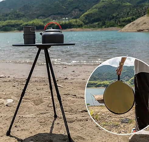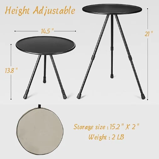 Tabella tal-ikkampjar li tiwi tal-liga tal-aluminju li tista 'tinqala', saqajn tal-mejda - liga tal-aluminju, piż ħafif, li jġorru tagħbija qawwija, mhux faċli biex jissaddad. Borża tal-Ħażna - Nylon, piż ħafif, reżistenza tajba għall-ilma, faċli biex titnaddaf.