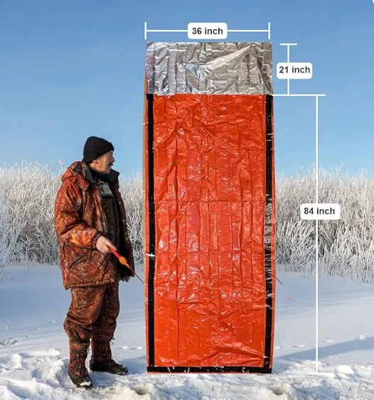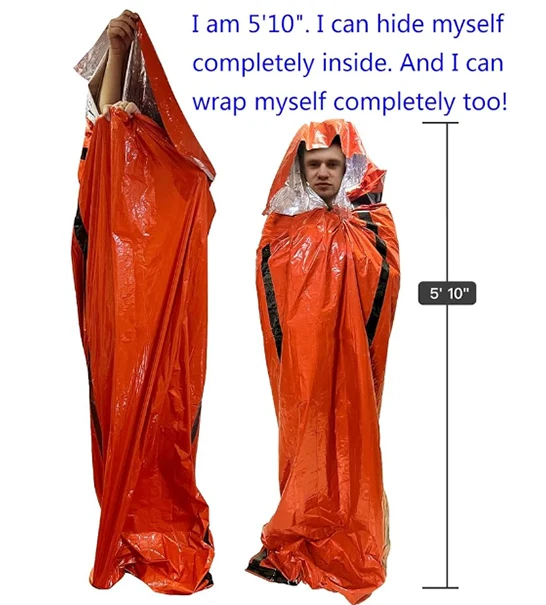 Bag ta 'sopravivenza ta' emerġenza jista 'jżid iċ-ċansijiet tiegħek ta' sopravivenza fit-temp kollu, l-istaġuni kollha u ċ-ċirkostanzi kollha. Huwa magħmul minn materjal mylar iżolanti durabbli ddisinjat min-NASA għall-esplorazzjoni tal-ispazju. Iżomm / jirrifletti lura 90% tas-sħana tal-ġisem. Huwa jista 'jerġa' jintuża, li ma jgħaddix ilma minnu u reżistenti.