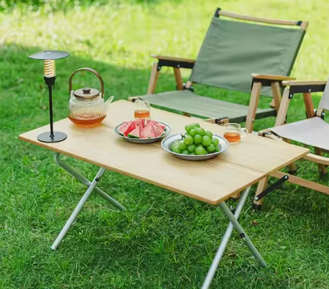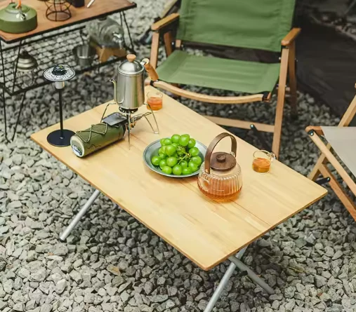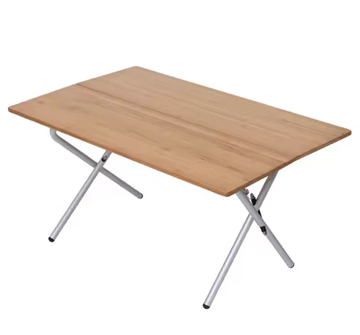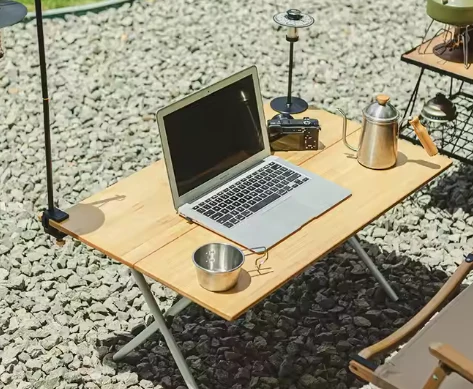 Tabella tal-bambu u tal-aluminju portabbli li tista 'tintewa, li hija b'saħħitha, b'saħħitha u favur l-ambjent. U li ma jgħaddix ilma minnu. Il-mejda bla xkiel hija perfetta biex tqiegħed xorb, snacks jew tagħmir tat-tisjir.