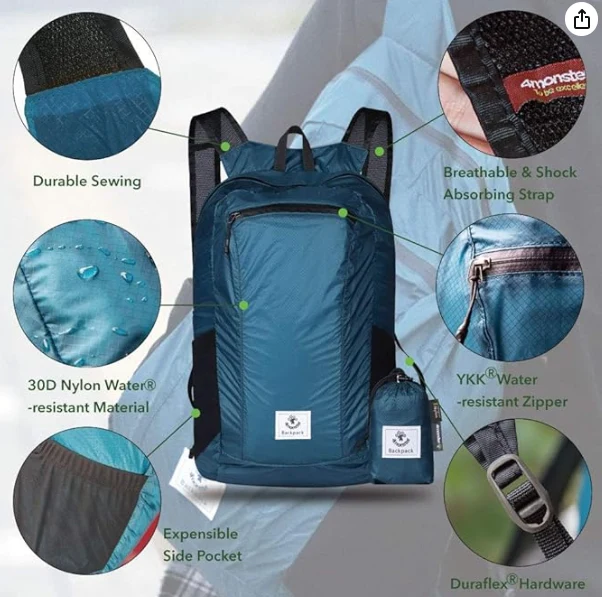 Backpack tal-mixi ħafif li ma jgħaddix ilma minnu, dan il-ġurnata tal-mixi ħafif huwa magħmul minn materjal reżistenti għall-ilma u biż-żippijiet. Effettivament jipprevjeni l-ilma tax-xita milli jxarrab it-telefon jew il-flus kontanti u oġġetti oħra fil-backpack.